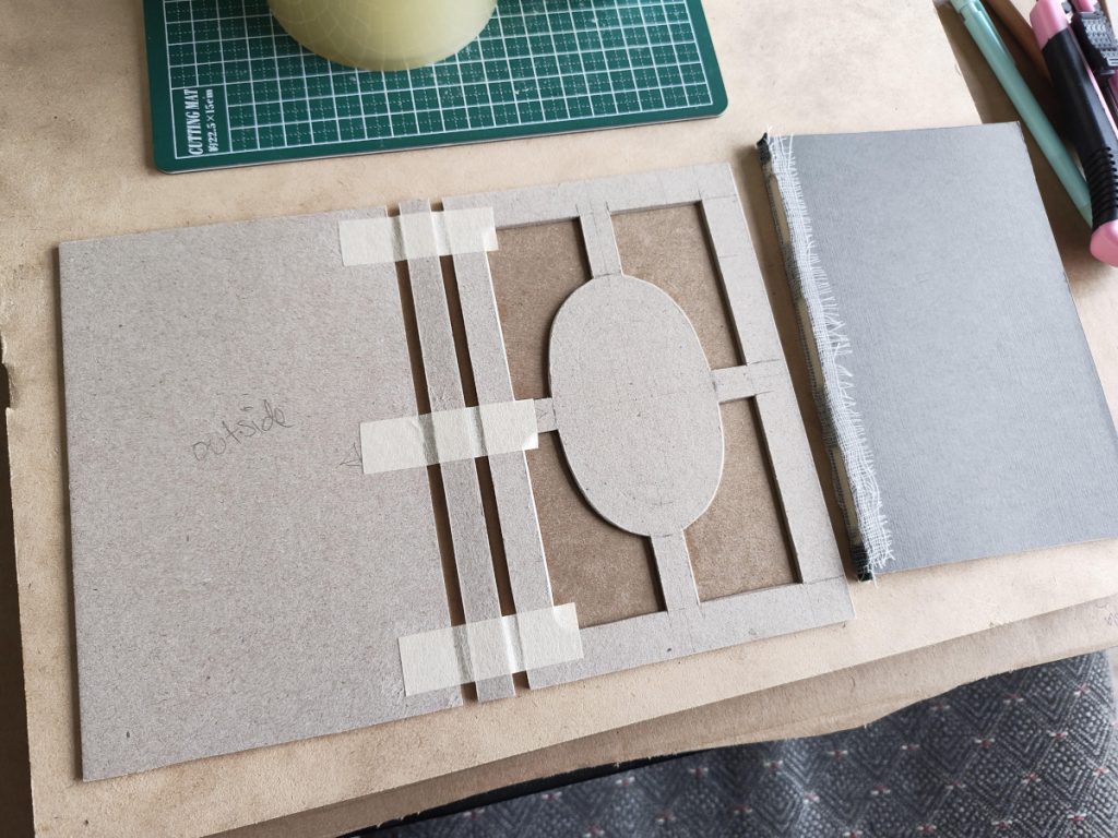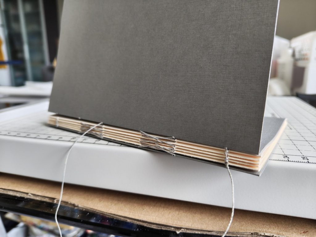 I then pressed and glued gauze to the spine to secure the book block, added green headbands to each end of the spine, and measured+cut out all the parts I needed to create the hardcover.