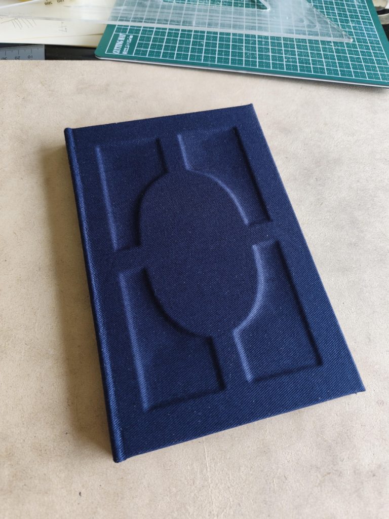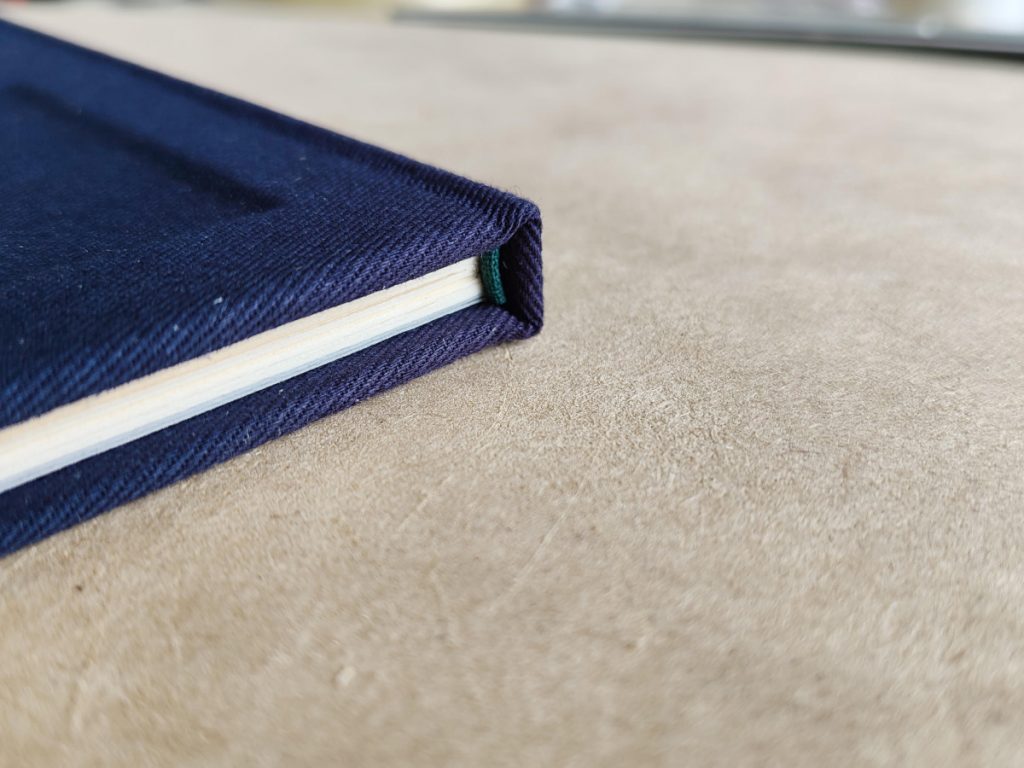I made my own book cloth using tissue, heat&bond, and a navy fabric. I glued all of this together, measuring the spine distance using the book block + bend allocation.